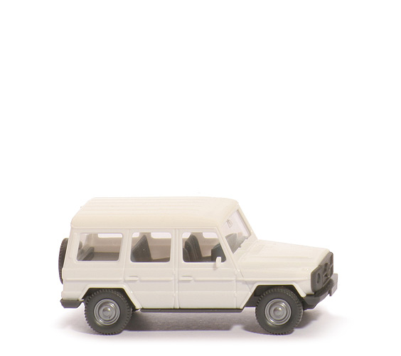 Farbe Karosserie | weiß | Hecktür | 1-teilig | Reserverad | an der Hecktür, Position: bis Hecktürkante | Grill | Teil des Chassis | Verglasung | klar | Dach | separat aufgesetzt | Inneneinrichtung | ca. graubeige | Chassis Farbe | basaltgrau | Bodenprägung | WIKING - Berlin-W | Zughaken | ohne | Räder | 9 mm | Radkappen | silbern |