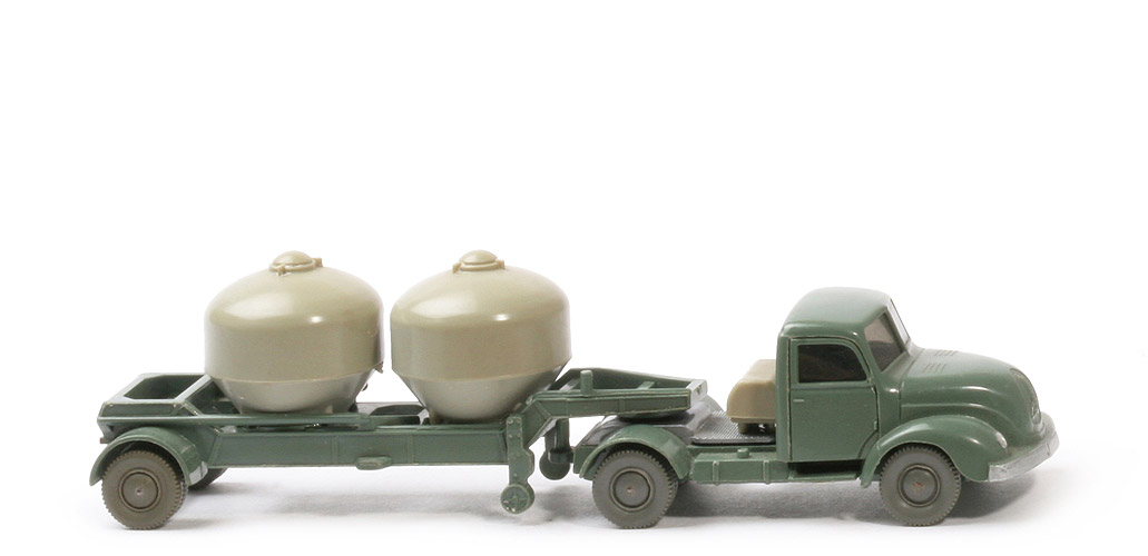 | Zugmaschine | Farbe Kabine | dunkelresedagrün | Version Kabine | Typ 3 | Stoßstange | abgeschrägt | Kabinenboden | ohne Schlitz | Verglasung | getönt | Chassis Farbe | dunkelresedagrün | Chassis Typ | Version 2 | Bemalung | Scheinwerfer, Stoßstange silbern | Sattelpfanne | alt, ohne Steg, für kleinen KöBo | Achshalterungen | geschlossen | Bodenprägung | WM (ohne Kreis) | Werkzeugkasten | kieselgrau hinter Kabine | Räder | 10 mm, neuere Ausführung | | Auflieger | Aufbau und Chassis | dunkelresedagrün | Zementbehälter | kieselgrau | Leiter | leider nicht mehr vorhanden | Achshalterungen | geschlossen | hinteres Kennzeichen | ungesilbert | Rückleuchten | rot | Räder | 10 mm, neuere Ausführung |