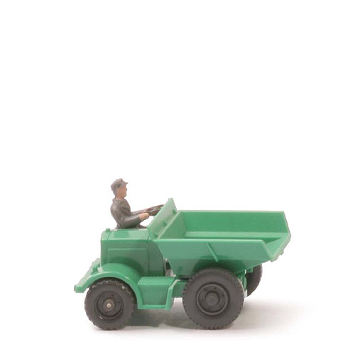 Farbe Karosserie | grün | Ausführung Motorabdeckung | 2 Nippel | Bodenprägung | WM, Germany, 657 | Farbe Mulde | grün | Silberung Mulde | ohne | Lenkrad Farbe | anthrazit | Fahrer | mit, ca. basaltgrau | Bemalung Fahrer | Gesicht, Hände | Räder Farbe | anthrazit | Räder Typ vorne | 12mm zeiteilig, Profil grob | Felgen | anthrazit | Räder Typ hinten | 10mm, Profil grob, 6-Loch | Bemalung Rückleuchten | ohne |
