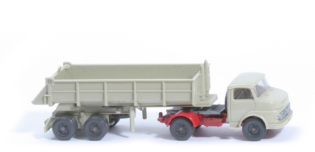 | Zugmaschine | Farbe Kabine | hellgelbgrau | Lüfter | ohne - Dach glatt | Eckfenster | immer ohne | Blinker | immer neben Scheinwerfern | Inneneinrichtung | ca. basaltgrau | Verglasung | klar | Chassis | hellbraunrot | Radlauf hinten | rot | Sattelpfanne | neu, für dünnen Bolzen | Reserverad | hinter Kabine | Räder | 11mm, einteilig, Profil fein | | Auflieger | Farbe Mulde und Klappe | hellgelbgrau | Farbe Chassis | hellgelbgrau | Bodenprägung Chassis | Wiking Germany | Farbe Scharnierhalterung | hellgelbgrau | Farbe Achshalterung | hellgelbgrau | Bodenprägung Achshalterung | 67 S | Königsbolzen | dünn, silbern eingesetzt | Reserverad | unter Chassis | Räder | 11mm, einteilig, Profil grob |