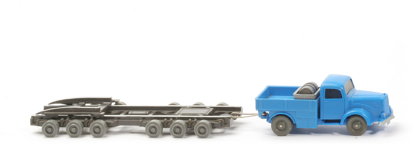 | Zugmaschine | Farbe Kabine | himmelblau | Version Kabine | ohne Schlitz hinter Nrn-Schild | Blinker | ohne | Verglasung | getönt | Dach | glatt | Bemalung | Scheinwerfer, Nummernschild | Bemalung Stoßstange | mit | Chassis | Version 2 | Achshalterungen | geschlossen | Chassis Farbe | himmelblau | Bodenprägung | WM ohne Kreis | Pritsche | himmelblau | Ladung | Kiste mit Öltonne | Farbe Tonne | silbern | Räder | 10mm, neuere Ausführung | | Anhänger Culemeyer | Farbe | anthrazit | Bodenprägung | WM im Kreis | Bremsplatte | Fläche mit Struktur | Bemalung | Gleise silbern | Deichsel | Metall | Räder | Walzenräder 7,8mm o. Profil | Farbe Räder | hellgrau |