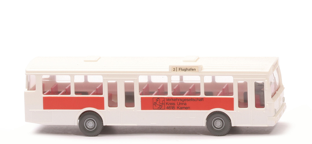 Farbe Karosserie | weiß | Dachlüfter | mit Rand | Bemalung vorne | Scheinwerfer silbern | Verglasung | klar | Sitze | helles rot | Fahrer | ca. basaltgrau | Fahrer Typ | Standard-Busfahrer | Bemalung Fahrer | Gesicht | Lenkrad | anthrazit, am Armaturenbrett | Stift vor Lenkrad | mit | Chassis Farbe | basaltgrau | Achshalterungen | verstärkt | Bodenprägung | WIKING, Berlin-W, 700 | Räder | 12 mm, Profil grob | Radkappen | silbern, eingesetzt | Beschriftung | Verkehrsgesellschaft Kreis Unna ... (s. Foto) | Beschriftung Art | Druck rot/schwarz | Zielangabe vorne/seitlich | 2 | Flughafen | hierbei Position der Ziffer | links | Bedruckung Heck | ohne |
