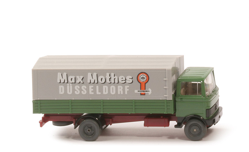 Kabine | dunkelmaigrün | Spiegelaufnahmen | mit | Grill | schwarz, eingesetzt | Grillbedruckung | ohne | Inneneinrichtung | ca. graubeige, Lkr integriert | Kotflügel, Stoßstange | schwarz | Chassis | ca. weinrot | Kotflügel hinten | schwarz | Bodenprägung | WIKING, Berlin-W | Reserverad | unter Chassis | Pritsche | dunkelmaigrün | Pritscheneinlage | Pappe, silbern | Verdeck | silbergrau, hinten geschlossen | Druck Plane Seiten | "Max Mothes, ...", Logo (s. Foto) | Druck Plane hinten | "Tel. 0211 3381 - 0" | Räder | 10 mm |
