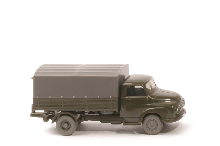 Kabine | olivgrün | Verglasung | getönt | Inneneinrichtung | ohne | Bemalung Scheinwerfer | silber | Bemalung Grill | silber | Bemalung Kennzeichen vorne | silber | Farbe Pritsche | olivgrün | Pritscheneinlage | ohne | Chassis Typ | im Bereich der Hinterachse offen | Chassis Farbe | olivgrün | Bodenprägung | WM | Bemalung Rückleuchten | rot | Bemalung Kennzeichen hinten | silber | Reserverad | auf Chassis | Plane | ca. basaltgrau | Räder | 10mm, hellgrau |