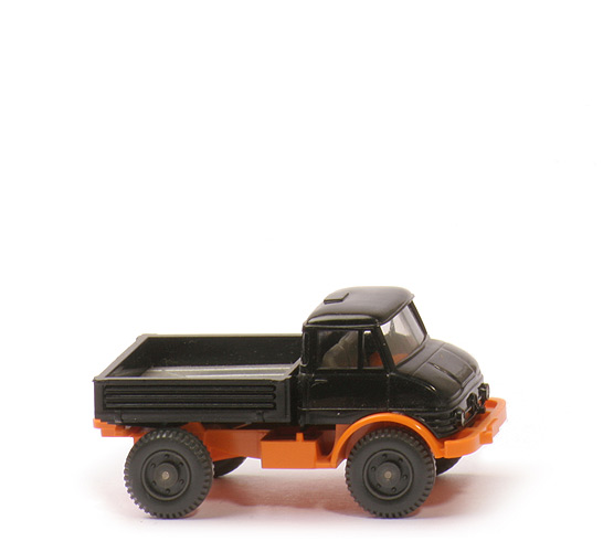 Farbe Kabine | schwarz | Verglasung | klar | Inneneinrichtung | ca. basaltgrau | Lenkrad | ohne | Chassis Farbe | orangegelb | Bodenprägung | 370, Wiking, Germany | Kardanelement Farbe | orangegelb | Reserverad | über Chassis | Pritsche | schwarz | Pritscheneinlage Typ | 6 Längsstreifen und trapezförmige Gravur | Pritscheneinlage Farbe | silbern | Bemalung | nur Scheinwerfer | Räder | 11 mm, 6-Loch | Farbe Räder | anthrazit |