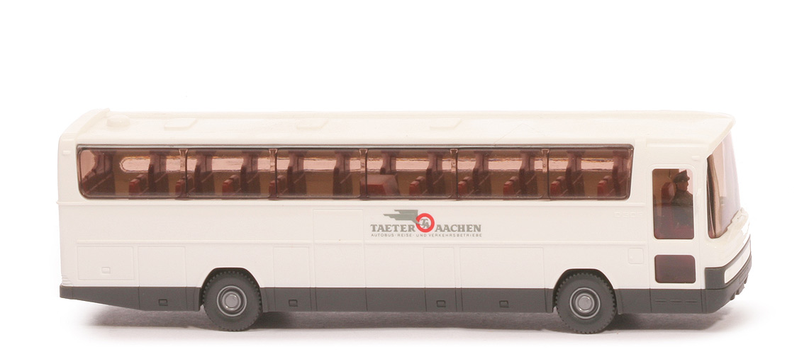 Farbe Karosserie | weiß | Bemalung vorne | ohne | Verglasung Seiten | rauch getönt | Verglasung Frontscheibe, Tür | rauch getönt | Inneneinrichtung | rot | Fahrer | anthrazit | Fahrer Typ | Standard-Busfahrer | Bemalung Fahrer | Gesicht | Lenkrad | anthrazit | Chassis Farbe | dunkelbasaltgrau | Bodenprägung | Mercedes O 303 RHD, WIKING, Berlin-W | Räder | 12 mm, Profil grob | Radkappen | silbern, eingesetzt | Bedruckung | Taeter Aachen ... (s. Foto) |