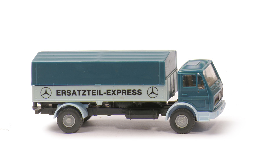 Kabine | azurblau | Spiegelaufnahmen | mit | Grill | eingesetzt, ohne Silberstreifen neben Stern | Verglasung | klar | Inneneinrichtung | Lenkrad integriert, ca. graubeige | Stoßstange, vorderer Kotflügel | weißblau | Typ vorderer Kotflügel | ohne Wulst | Scheinwerfer | unbemalt, mit integrierten Blinkern | Chassistyp | Zughaken auf Dreieck | Chassisfarbe | anthrazit | Radlauf hinten | weißblau | Reserverad | mittig unter Prtische | Pritsche | ~wärrigblau, Seiten glatt, mit vier Schließungen je Seite | Pritschengestell | anthrazit | Pritscheneinlage | lichtgrau | Plane Farbe | azurblau | Plane Typ | niedrig, hinten offen, Steckleisten seitlich | Beschriftung | Ersatzteil-Express (s. Foto) | Beschriftung Art | Druck schwarz | Räder | 12mm, Profil grob | Felgen | 6-Loch, silbergrau |