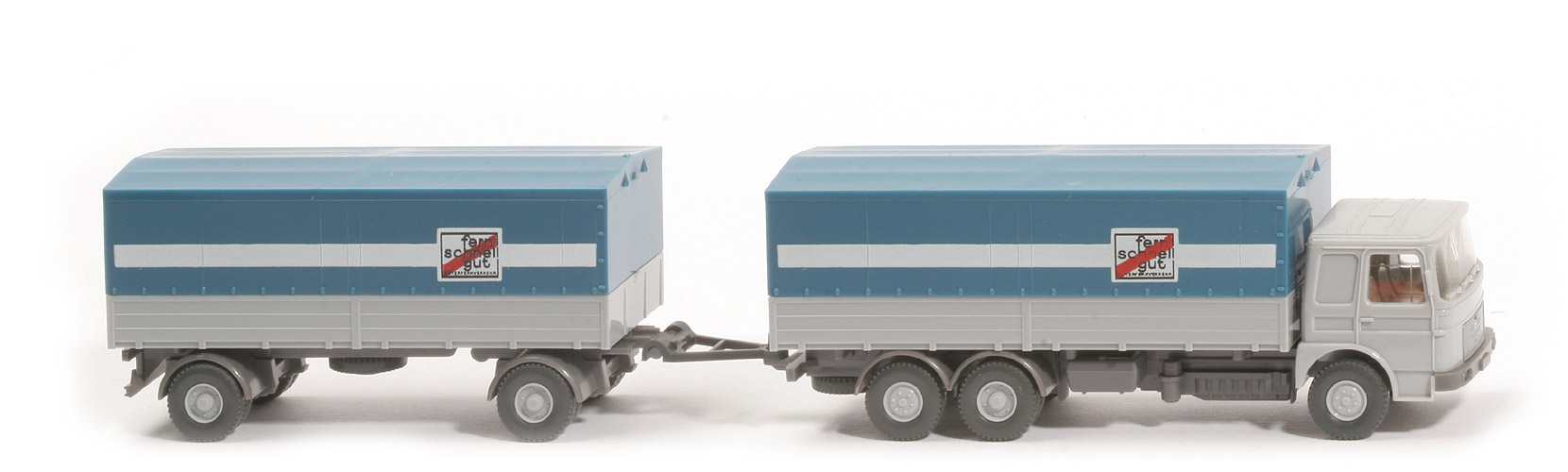 | Zugwagen | Aufbau | silbergrau | Verglasung | klar | Inneneinrichtung | mit Lenkrad | Spiegel | mit | Scheibenwischer | mit | Dachlüfter | flach | Grill | silbern | Chassis | staubgrau | Zughaken | lang | Plane | azurblau | Druck | fernschnellgut (s. Foto) | | Hänger | Pritsche | silbergrau | Chassis | staubgrau | Plane | azurblau | Druck | fernschnellgut (s. Foto) | Pritscheneinlagen | Kunststoff silber | Unterfahrschutz | mit | Räder | 12mm, Profil grob | Felgen | silbergrau |
