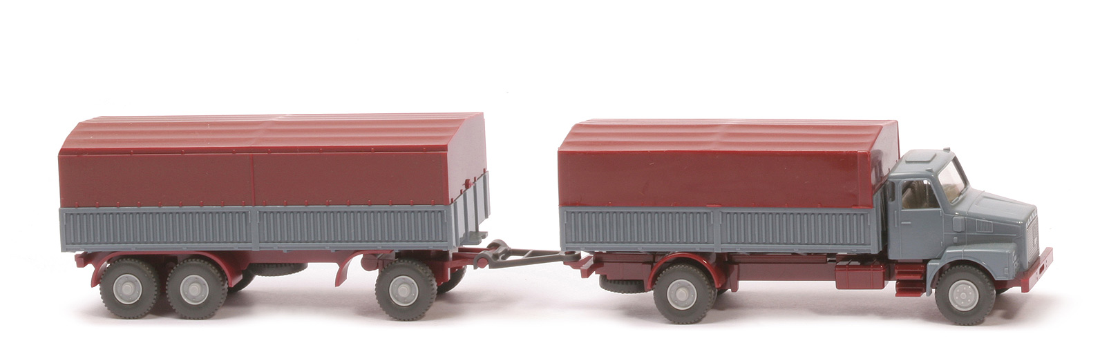| Zugwagen | Kabine | graublau | Verglasung | klar | Inneneinrichtung | ca. graubeige, Lkr integriert | eingesetzter Grill | silbern | Scheinwerfer | ungesilbert | Trittstufen | rotbraun | Chassis | rotbraun | Kardaneinsatz | rotbraun | Bodenprägung | WIKING, Berlin-W | Radlauf hinten | rotbraun | Reserverad | hinten unter Chassis, gesteckt | Pritsche Typ | Stahlpritsche | Pritsche Farbe | graublau | Pritscheneinlage | ca. silbergrau | Plane | rotbraun | Räder | 12 mm, Felgen eingesetzt | Felgen | 6-Loch, silbergrau | | Anhänger | Pritsche Typ | Stahlpritsche | Pritsche Farbe | graublau | Pritscheneinlage | ca. silbergrau | Chassis | rotbraun | Achsaufhängungen | für Einfach-Bereifung | Bodenprägung | WIKING Germany, 40 d | Plane | rotbraun | Räder | 12 mm, Felgen eingesetzt | Felgen | 6-Loch, silbergrau |