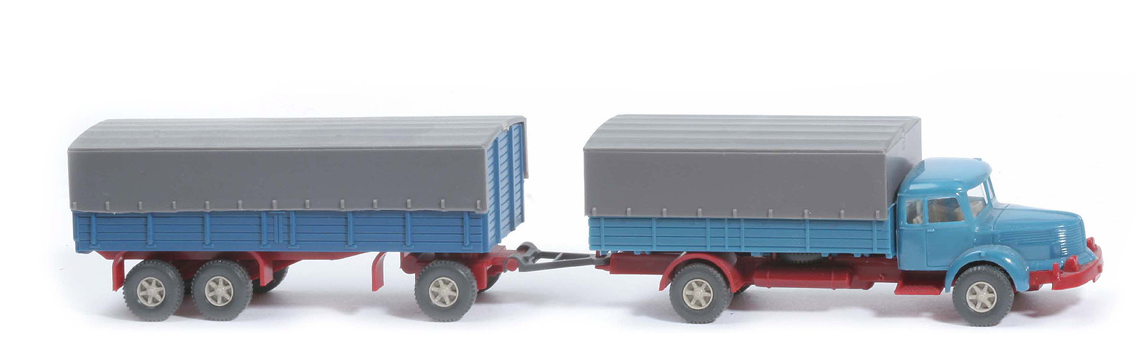 | Zugwagen | Kabine Farbe | azurblau | Blinker | mit | Bemalung Scheinwerfer | ohne | Bemalung Peilstangen | ohne | Bemalung Kennzeichen | ohne | Chassis Farbe | hellbraunrot | Chassis Typ | 4c | Typ Peilstangen | 2,4 mm lang | Achshalterungen | offen | Bodenprägung | WIKING GERMANY | Markierungspunkt unter Motor | ohne | Trittbretter unten | Randgravur | vor Verteilergetriebe | geschlossen | Aufpuffrohr mittig | nicht mehr ganz so fein graviert | Reserveradhalterung | mit Stiften | hinter Hinterachskardan | geschlossen | Quertraverse hinten | mit | Reserverad | mittig unter Pritsche | Farbe Pritsche | azurblau | Bemalung Kennzeichen | ohne | Bemalung der einen Rückleuchte | ohne | Plane | hinten geschlossen | Farbe Plane | basaltgrau | Räder | 12mm, eingesetzte Trilexfelgen | | Hänger | Farben | Aufbau abweichend capriblau | Bodenprägung Aufbau | WM ohne Kreis | Bodenprägung Chassis | Germany | Schwingachsen | trapezförmig |