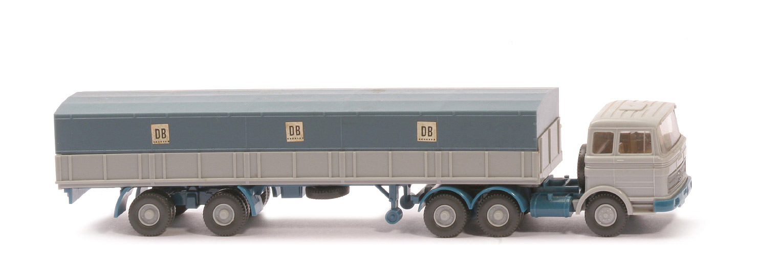 | Zugmaschine | Typ | Dach querversteift | Kabine | silbergrau | Spiegel | ohne | Scheibenwischer | ohne | Verglasung | klar | Lenkrad | ohne | Inneneinrichtung | ca. hellgelbgrau | Stoßstange | azurblau, Scheinwerfer ungesilbert | Chassis | azurblau | Zentriernippel für Pritsche | mit | Radlauf hinten | zweiteilig azurblau | Reserverad | hinter Kabine | Sattelpfanne | für großen KöBo | Räder | Profil grob | Felgen | silbergrau | | Auflieger | Pritsche Farbe | silbergrau | Chassis Farbe | azurblau | Pritscheneinlage | Pappe, silbern | Plane Farbe | hellazurblau | Reserverad | unter Auflieger, gesteckt | Unterfahrschutz | ohne | Königsbolzen | stark | Räder | Profil grob | Felgen | silbergrau |