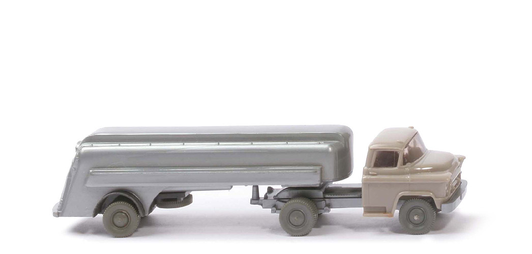 Zugmaschine in Sonderfarbe graubeige. Nicht in den Katalogen gelistet. Wohl eine sogenannte Nachserie: Das Zugmaschinenchassis trägt die Bodenprägung Wiking Germany. |