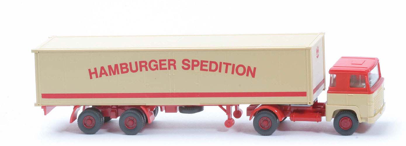 | Zugmaschine | Dach | orangerot | Kabine oben | orangerot | Kabine unten | hellbeige | Stoßstange | hellbeige | Scheinwerfer | 2, gesilbert | Spiegel | mit | Scheibenwischer | ohne | Lenkrad | mit | Sattelpfanne | für großen Königsbolzen | Reserverad | ohne | Chassis Farbe | orangerot | Räder | 12mm, Profil grob | Felgen | hellbraunrot | | Koffer | Art | mit Seitentür-Andeutung | Dach | hellbeige | Korpus | hellbeige | Türen | neu, hellbeige | Beschriftung | Hamburger... (s. Foto) | Chassis | orangerot | Unterfahrschutz | ohne | Königsbolzen | stark | Räder | 12mm, Profil grob | Felgen | hellbraunrot |