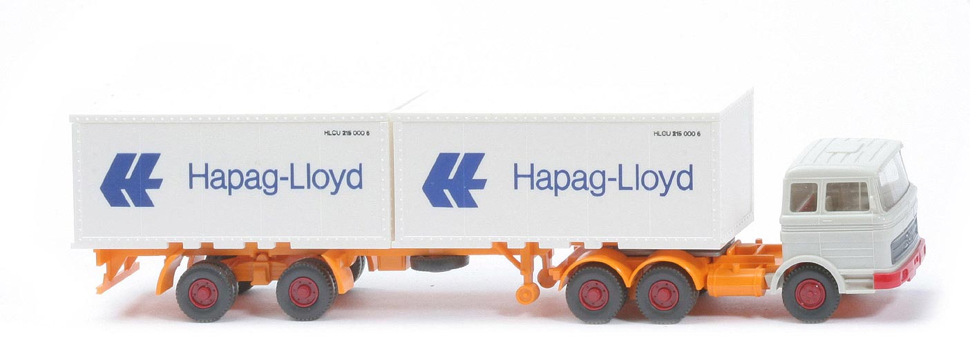 | Zugmaschine | Typ | Dach querversteift | Kabine | grauweiß | Spiegel | mit | Lenkrad | mit | Scheibenwischer | ohne | Inneneinrichtung | ca. hellolivgrau | Stoßstange | rot | Chassis | orangegelb | Radlauf hinten | orangegelb | Reserverad | hinter Kabine | Räder | Profil grob | Felgen | hellbraunrot | | Container | Art | 2 x 20 ft neu | Farbe | weiß | Türen | alt | Beschriftung | Hapag-Lloyd (s. Foto) | Beschriftung Art | 36mm, mit Nummer (Serie) | | Auflieger | Farbe | orangegelb (wie Serie) | Unterfahrschutz | mit | Königsbolzen | stark | Räder | Profil grob | Felgen | hellbraunrot |