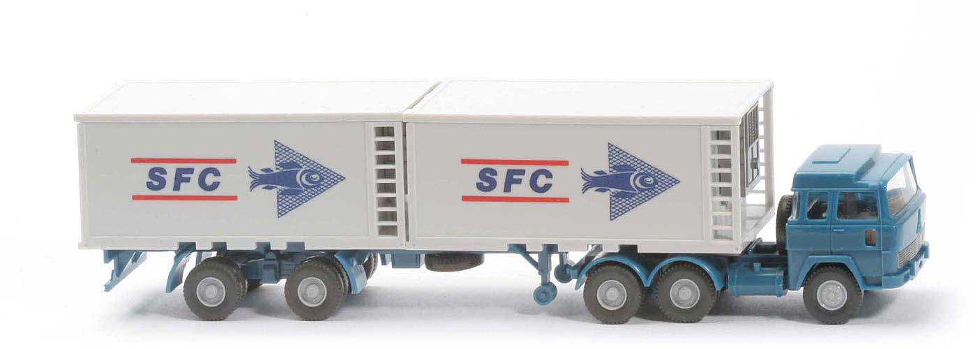 | Zugmaschine | Kabine oben | azurblau | Kabine unten | azurblau | Verglasung | klar | Inneneinrichtung | graubeige | Lenkrad | mit | Grill | silber | Chassis | azurblau | Radlauf hinten | azurblau. 2-teilig | Sattelpfanne | für großen Königsbolzen | Reserverad | hinter Kabine | Räder | Profil grob | Felgen | silbergrau | | Container | Art | 2 x 20 ft Kühlcontainer | Farbe | altweiß | Kühlaggregat | silbern | Türen | alt | Beschriftung | SFC + Fischsymbol | Beschriftung Art | Druck blau und rot | | Auflieger | Farbe | azurblau | Unterfahrschutz | mit | Königsbolzen | stark | Räder | Profil grob | Felgen | silbergrau |