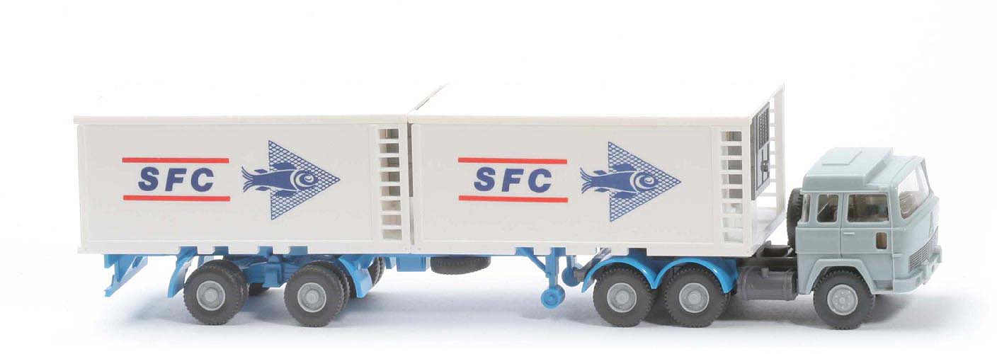 | | Zugmaschine | | Kabine oben | hellblaugrau | | Kabine unten | hellblaugrau | | Verglasung | klar | | Inneneinrichtung | graubeige | | Lenkrad | mit | | Grill | silber | | Chassis | staubgrau | | Radlauf hinten | lichtblau. 2-teilig | | Sattelpfanne | für großen Königsbolzen | | Reserverad | hinter Kabine | | Räder | Profil grob | | Felgen | silbergrau | | | Container | | Art | 2 x 20 ft Kühlcontainer | | Farbe | weiß | | Kühlaggregat | silbern | | Türen | alt | | Beschriftung | SFC + Fischsymbol | | Beschriftung Art | Druck blau und rot | | | Auflieger | | Farbe | lichtblau | | Unterfahrschutz | mit | | Königsbolzen | stark | | Räder | Profil grob | | Felgen | silbergrau |