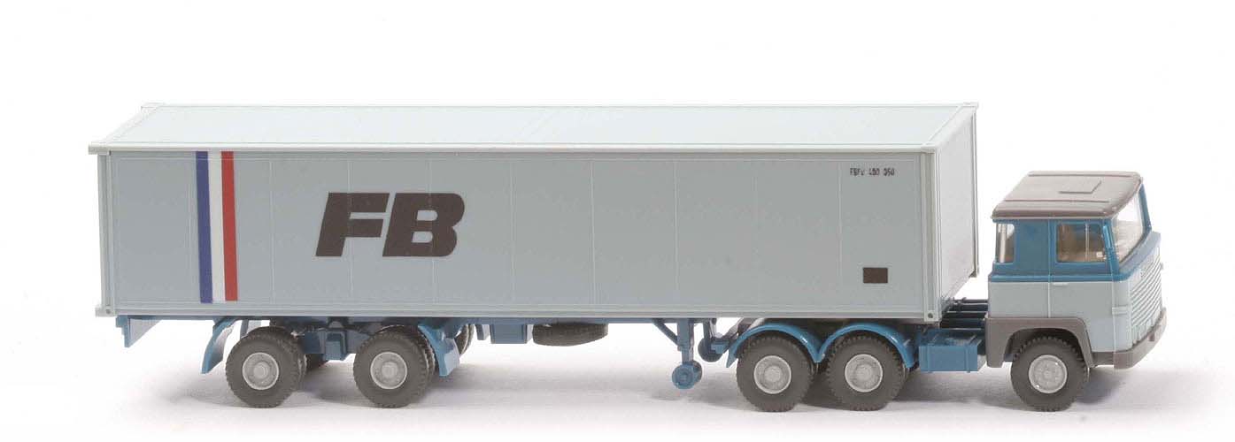 | | Zugmaschine | | Dach | basaltgrau | | Kabine oben | azurblau | | Kabine unten | hellblaugrau | | Stoßstange | basaltgrau | | Scheinwerfer | 2, ungesilbert | | Spiegel | mit | | Scheibenwischer | ohne | | Lenkrad | mit | | hinterer Radlauf | azurblau | | Sattelpfanne | für großen Königsbolzen | | Reserverad | ohne | | Chassis Farbe | azurblau | | Räder | 12mm, Profil grob | | Felgen | silbergrau | | | Container | | Art | 40 ft Glattwand | | Dach | hellblaugrau | | Korpus | hellblaugrau | | Türen | neu, hellblaugrau | | Beschriftung | FB... (s. Foto) | | | Auflieger | | Farbe | azurblau | | Unterfahrschutz | ohne | | Königsbolzen | stark | | Räder | 12mm, Profil grob | | Felgen | silbergrau |
