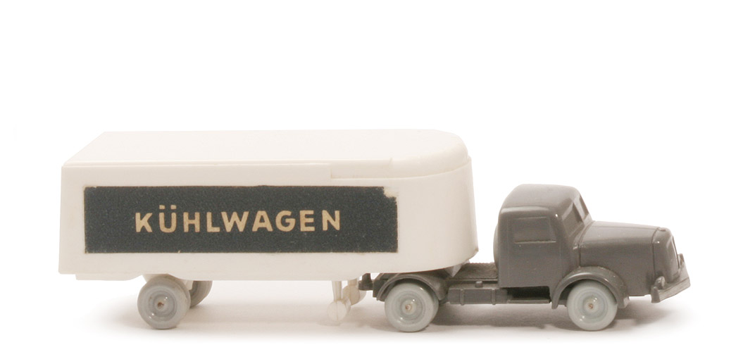 Achsen | Rollachser | | Zugmaschine | Farbe Kabine | basaltgrau | Farbe Chassis | basaltgrau | Bemalung | Scheinwerfer, Stoßstange | Sattelpfanne | eingesetzt, in Chassisfarbe | Chassis | Version 1a | Achshalterungen | geschlossen | Bodenprägung | WM im Kreis | Reserverad | hinter Kabine | Räder | sog. Porzellanräder | | Auflieger | Farbe Oberteil | weiß | Farbe Unterteil | weiß | Radlauf | ohne Kotflügel | Bodenprägung | WM im Kreis | Rückleuchten | ohne | Dach | glänzend | Aufkleberart | Papier, matt | Beschriftung | Kühlwagen (s. Foto) | Beschriftung Farbe | blau mit weißer Schrift | Räder | sog. Porzellanräder |