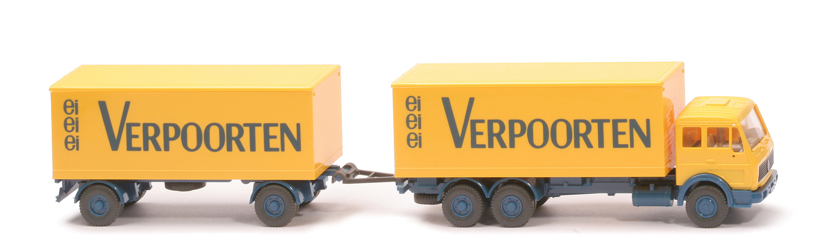 | Zugwagen | Kabine | gelb | Grill | schwarz, ohne Streifen | Lüfter | hoch | Heckfenster | geschlossen | Spiegelaufnahmen | mit | Inneneinrichtung | ca. rotelfenbein | Stoßstange | capriblau | Chassis | capriblau | Radlauf hinten | 2-teilig, capriblau | Reserverad | hinten unter Chassis | Koffer Korpus | gelb | Koffer Dach | gelb | Koffer Türen | gelb | Beschriftung | Verpoorten ... (s. Foto) | Räder | 12 mm, Profil grob | Felgen | capriblau, 8-Loch | | Anhänger | Koffer Korpus | gelb | Koffer Dach | gelb | Koffer Türen | gelb | Drehschemel | capriblau | Radlauf vorne | capriblau | Radlauf hinten | capriblau | Chassis | capriblau | Beschriftung | Verpoorten ... (s. Foto) | Räder | 12 mm, Profil grob | Felgen | capriblau, 8-Loch |