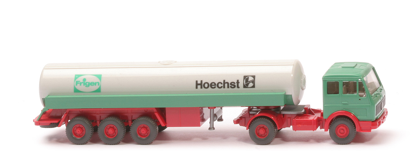 | | Zugmaschine | | Kabine | grün | | eingesetzter Grill | schwarz, ohne Streifen | | Lüfter | hoch | | Heckfenster | geschlossen | | Spiegelaufnahmen | mit | | Inneneinrichtung | ca. hellolivgrau | | Stoßstange | rot | | Chassis | rot | | Radlauf hinten | rot | | Reserverad | ohne | | Räder | 12 mm, Profil grob | | Felgen | 8-Loch, rot | | | Auflieger | | Tank | altweiß | | Galerie | grün | | Chassis | rot | | Dreiachsaggregat Farbe | rot | | Dreiachsaggregat Typ | Kotflügel eckig, eingesteckt | | Stütze | Hydraulikstempel, silber | | Reserverad | hinter Achseinheit | | Beschriftung Tank Seite | Hoechst, Frigen ... (s. Foto) | | Räder | 12 mm, Profil grob | | Felgen | 8-Loch, rot |