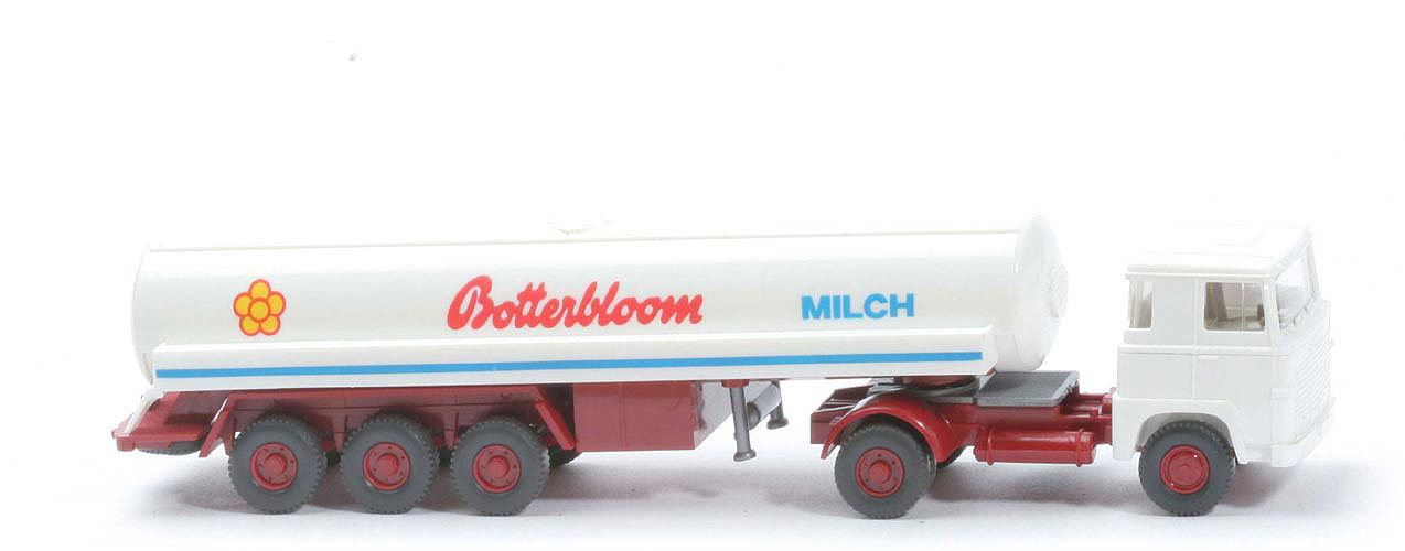 | Zugmaschine | Dach | weiß | Kabine oben | weiß | Kabine unten | weiß | Stoßstange | weiß | Frontbeschriftung | SCANIA | Scheinwerfer | 2, ungesilbert | Spiegel | mit | Scheibenwischer | mit Aufsatz | Lenkrad | mit | Sattelpfanne | für großen Königsbolzen | Reserverad | unter Chassis | Chassis Farbe | hellbraunrot | Rücklichtstangen | ohne | Räder | 12mm, Profil grob | Felgen | hellbraunrot | | Auflieger | Tank | weiß | Galerie | weiß | Chassis | hellbraunrot | Achseinheit | hellbraunrot | Stütze | Hydraulikstempel, silber | Reserverad | hinter Achseinheit | Beschriftung | Botterbloom (s. Foto) | Räder | 12mm, Profil grob | Felgen | hellbraunrot |
