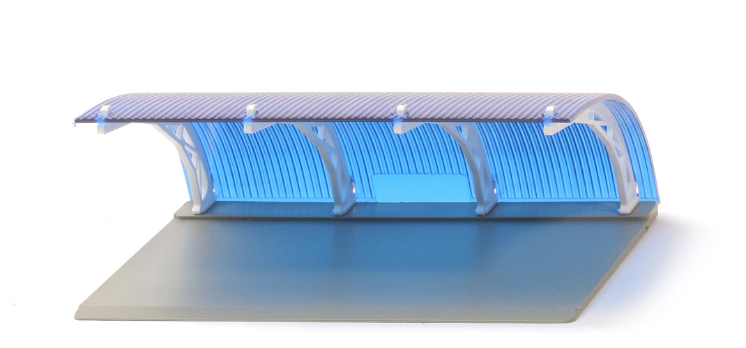 Dach | blautransparent | Träger | weiß | Bodenplatte | helles betongrau | Bodenprägung | neues WIKING-Logo, Parkhalle |