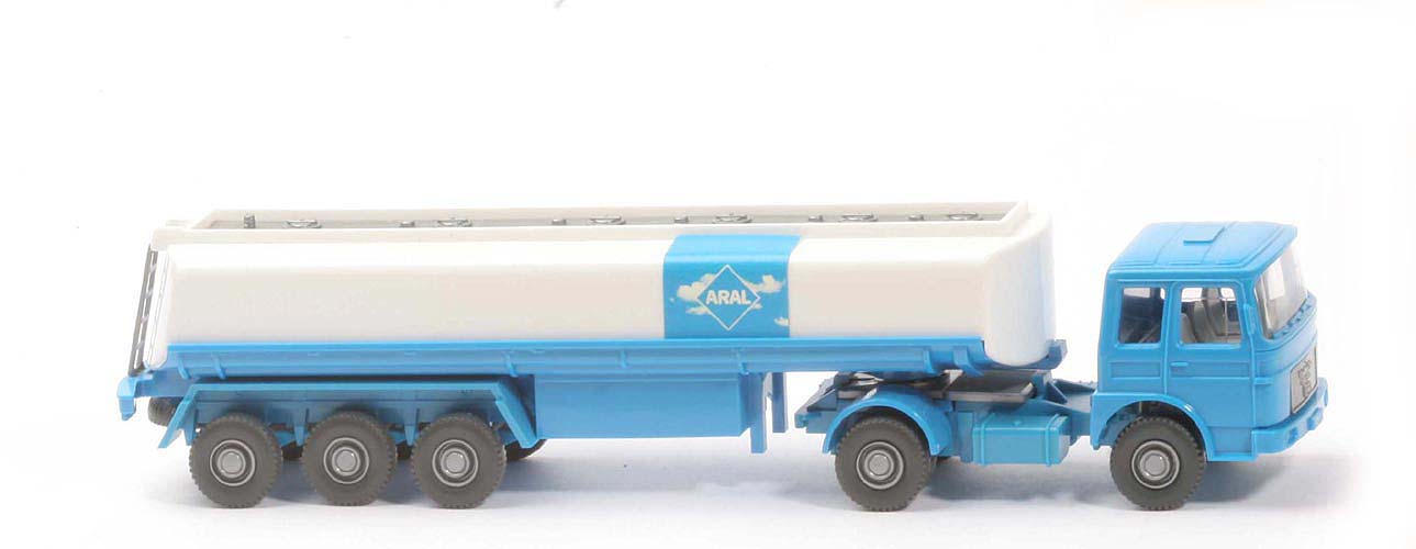 | Zugmaschine | Fahrerhaus | lichtblau | Verglasung | klar | Inneneinrichtung | mit Lenkrad | Spiegel | mit | Scheibenwischer | mit | Lüftergitter | ohne | Grill | silbern, mit Löwe | Motorblock | silbern | Chassis | lichtblau, neu | Räder | 12mm, Profil grob | Radkappen | silbern | | Auflieger | Tank | weiß | Unterteil | lichtblau | Achseinheit | lichtblau | Kotflügel Achseinheit | eckig | Leiter | mit | Beschriftung Seite | Papieraufkleber ARAL Wolken | Beschriftung Heck | Druck ARAL Logo | Räder | 12mm, Profil grob | Radkappen | silbern |