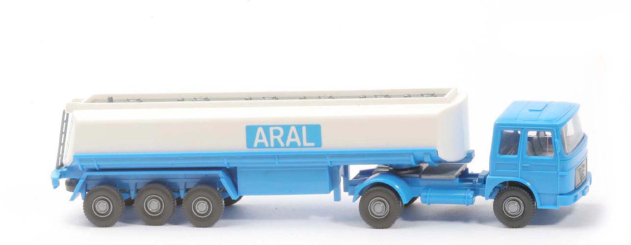 | Zugmaschine | Fahrerhaus | lichtblau | Verglasung | klar | Inneneinrichtung | mit Lenkrad | Spiegel | mit | Scheibenwischer | ohne | Lüftergitter | ohne | Grill | silbern, mit Löwe | Motorblock | silbern | Chassis | lichtblau, alt | Räder | 12mm, Profil grob | Radkappen | silbern | | Auflieger | Tank | weiß | Unterteil | lichtblau | Achseinheit | lichtblau | Kotflügel Achseinheit | eckig | Leiter | mit | Beschriftung Seite | ARAL im Rechteck, Druck | Beschriftung Heck | ARAL Logo, Druck | Räder | 12mm, Profil grob | Radkappen | silbern |