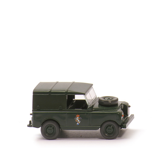 Farbe Karosserie | tannengrün | Frontscheibe | klar transparent, eingeklebt | Sitze | tannengrün | Fahrer | ohne | Lenkrad | separat eingesetzt, schwarz | Reserverad | auf der Haube | Chassis | tannengrün | Bodenprägung | neues WIKING-Logo, 100 | Zughaken | dünn, integriert | Bedruckung Scheinwerfer | silber | Bemalung Blinker vorne | orange | Bemalung Rückleuchten | rot | sonstiger Druck | Türen und Heck mit Wappen, Front Union Jack | Räder Typ | 9 mm, Felgen tannengrün, eingesetzt | Räder Farbe | anthrazit | Verdeck | tannengrün |