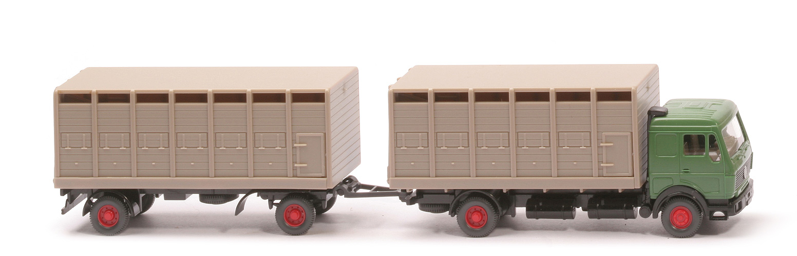 | Zugwagen | Kabine Farbe | maigrün | hintere Seitenfenster | geschlossen | Scheibenwischer | mit | Heckfenster | geschlossen | eingesetzter Grill | schwarz, mit MB-Stern, ohne Streifen | Inneneinrichtung | ca. graubeige mit Lenkrad | Ansaugstutzen | schwarz, hinter Kabinenrückwand | Stoßstange | schwarz | Chassis | schwarz, BP WIKING, Berlin-W | Radlauf hinten | schwarz | Reserverad | hinten unter Chassis | Aufbau | graubeige | Beschriftungen | keine | Räder | 11 mm (!) | Felgen | 8-Loch, rot | | Anhänger | Chassis | schwarz | Achshalterungen | schwarz | Unterfahrschutz | mit | Reserverad | unter Chassis | Aufbau | graubeige | Beschriftungen | keine | Räder | 11 mm (!), Felgen eingesetzt | Felgen | 8-Loch, rot |