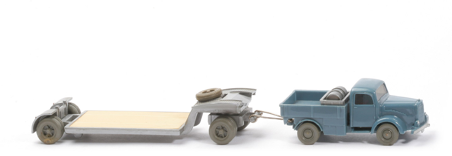 | Zugmaschine | Farbe Kabine | mattgraublau | Version Kabine | ohne Schlitz hinter Nrn-Schild | Blinker | ohne | Verglasung | getönt | Dach | glatt | Bemalung | Scheinwerfer, Nummernschild | Bemalung Stoßstange | mit | Chassis | Version 2 | Achshalterungen | geschlossen | Chassis Farbe | mattgraublau | Bodenprägung | WM ohne Kreis | Pritsche | mattgraublau | Ladung | Kiste mit Öltonne | Farbe Tonne | silber | Räder | 10mm, neuere Ausführung | | Anhänger | Grundfarbe | silber | Hängertyp | Typ 2: Steckhalterungen | Pritscheneinlage | hellbeige | Deichsel | Metall | Bemalung Rückleuchten | rot | Bemalung Rückstrahler | rot | Räder | 12mm Trilex, einteilig | Farbe Räder | hellgrau |