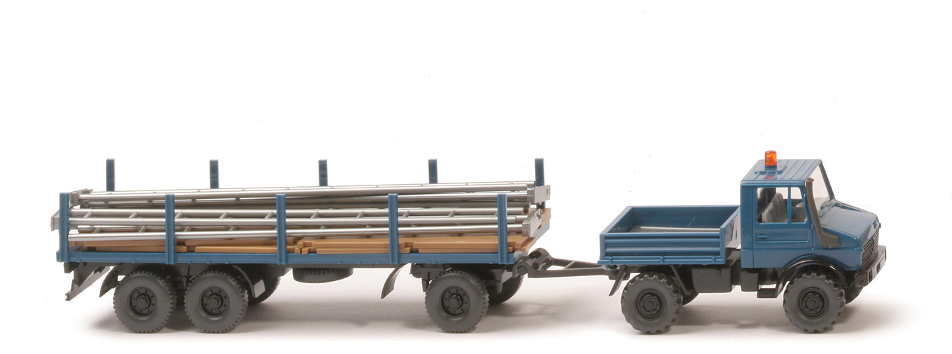 | | Zugmaschine | | Farbe Kabine | capriblau | | Warnlicht | orange transparent mit Sockel | | Verglasung | klar | | Inneneinrichtung | ca. lichtgrau | | Lenkrad | integriert | | angesetzter Ansaugstutzen | anthrazit | | Kotflügel vorne/Grill | schwarz | | Kotflügel hinten | schwarz | | Chassis | schwarz | | Zughaken | mit | | Bodenprägung | WIKING, Berlin-W | | Kardanelement Farbe | schwarz | | Pritsche | capriblau | | Pritscheneinlage | silbern | | Bemalung | ohne | | Räder | 12 mm, grobstollig, separate Felgen | | Felgen | 8-Loch, schwarz | | | Anhänger | | Aufbau mit Rungen | capriblau | | Chassis | schwarz | | Bodenprägung | WIKING, Berlin-W | | Doppelachsaggregat | schwarz | | Drehschemel | schwarz | | Deichsel | schwarz | | Ladung | 12 Holzbohlen ca. ockerbraun, 6 Gerüststützen silbern | | Räder | 12 mm, 2-teilig, Felgen eingesetzt | | Felgen | 8-Loch, schwarz |