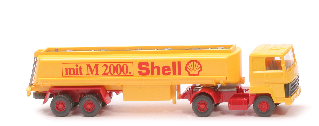 | Zugmaschine | Fahrerhaus Typ | Version 3, Grill schwarz | Kabine oben | gelb | Kabine unten | gelb | Verglasung | klar | Inneneinrichtung | ca. graubeige, Lkr integriert | Chassis | rot, verstärkte Halterung der Sattelpfanne | Bodenprägung | WIKING Berlin-W | Sattelpfanne | für großen Königsbolzen | Radlauf hinten | rot | Räder | 12 mm, Felgen eingesetzt | Felgen | 8-Loch rot | | Auflieger | Tank | gelb | Unterteil | gelb | Füllanlage | silbern | DAA Typ | Version 4b Klipsachsen, Kotflügel eckig | DAA Farbe | rot | Leiter | silbern | Beschriftung Seite | mit M 2000., Shell, Shell-Logo | Beschriftung Heck | Shell-Logo (Muschel) | Räder | 12 mm, Felgen eingesetzt | Felgen | 8-Loch rot |