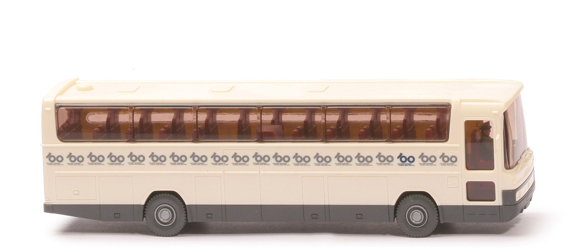 Farbe Karosserie | cremeweiß | Bedruckung vorne | ohne | Verglasung Seiten | rauch getönt | Verglasung Frontscheibe, Tür | rauch getönt | Inneneinrichtung | ca. hellbraunrot | Fahrer | Standardbusfahrer | Fahrer Farbe | anthrazit | Fahrer Bemalung | Gesicht | Lenkrad | anthrazit | Chassis Farbe | dunkelbasaltgrau | Bodenprägung | Mercedes O 303 RHD, WIKING, Berlin-W | Räder | 12 mm, Profil grob | Radkappen | silbern, eingesetzt | Bedruckung Seite | 100 Jahre ... (s. Foto) | Bedruckung Heck | wie Seite - umlaufend |