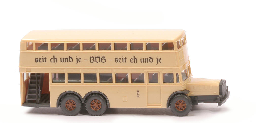 Karosserie Farbe | hellbeige | Einstieg hinten | offen | Verglasung | klar | Fahrer Farbe | anthrazit | Fahrer Typ | Standard-Busfahrer | Fahrer Bemalung | Gesicht | Lenkrad | anthrazit | Farbe Sitze | patinagrün | hintere Fahrgastraumbegrenzung | ca. basaltgrau | Treppe hinten | ca. basaltgrau | Haltestange | Metallachse, schwarz lackiert | Chassis Farbe | anthrazit | Kardanelement Farbe | anthrazit | Bodenprägung | WIKING, Berlin-W | Beschriftung | seit eh und je - BVG - (... s. Foto) | Beschriftung Art | Druck | Zielbeschriftung vorne | ohne | Stadtwappen/BVG-Emblem | beidseits | sonstige Bedruckung | ohne | Räder Typ | 12 mm, Profil grob | Felgen | Trilex, ca. lehmbraun |