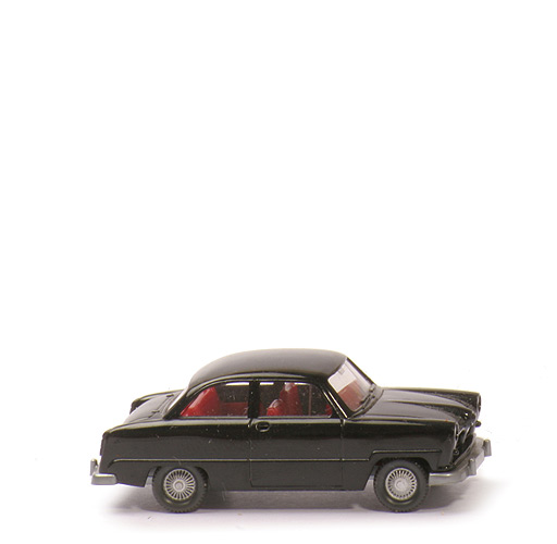 Farbe Karosserie | schwarz | Inneneinrichtung | rot | Lenkrad | integriert | Bemalung Scheinwerfer | silber | Bemalung Rückleuchten | ohne | Chassis | silbern | Bodenprägung | Ford 12M, WIKING, Berlin-W | Räder Art | Riffelkappe, gesilbert |