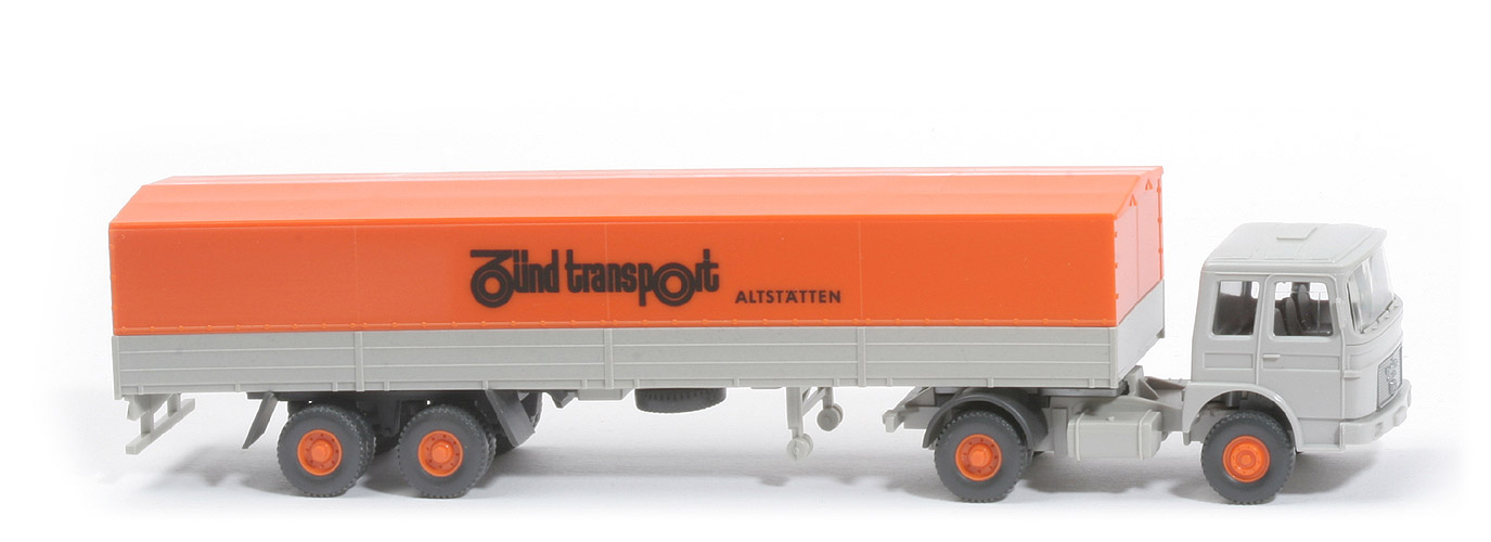 | Zugmaschine | Fahrerhaus | lichtgrau | Verglasung | klar | Inneneinrichtung | mit Lenkrad | Spiegel | mit | Scheibenwischer | mit | Lüftergitter | ohne | Grill | silbern, mit Löwe | Motorblock | silbern | Chassis | lichtgrau, neu | | Auflieger | Art | 4-fach-Teilung | Farbe Pritsche | lichtgrau | Pritsche Bodenprägung | Wiking, Berlin-W | Chassis | lichtgrau | Pritscheneinlage | Pappe, silbern | Plane | orange | Druck | Zündtransport Altstätten | Stützen | als Rollen, eingesetzt | Doppelachsaggregat | dunkelbasaltgrau | Doppelachsaggegat Typ | Version 4b, Kotflügel eckig | Heck | gerade | Warndreiecke | neben Rückleuchten | Räder | 12mm, Profil grob | Felgen | 8-Loch, orange |