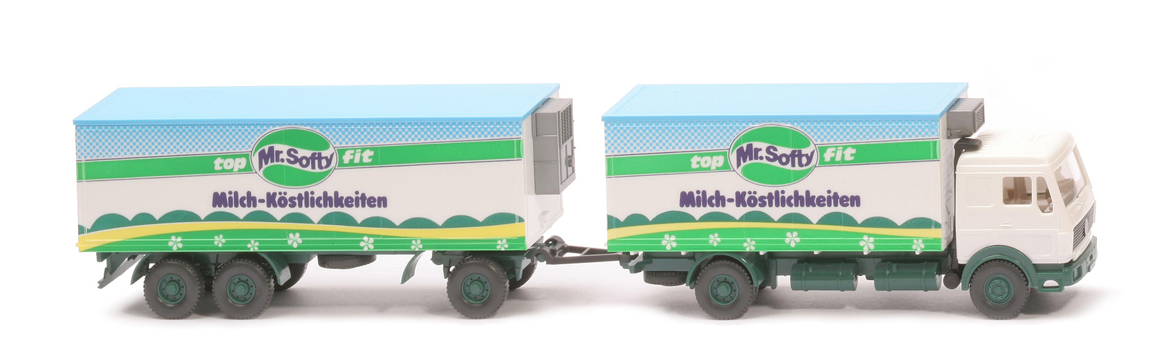 | Zugwagen | Kabine Farbe | weiß | hintere Seitenfenster | geschlossen | Scheibenwischer | mit | Heckfenster | geschlossen | eingesetzter Grill | schwarz, mit MB-Stern, ohne Streifen | Inneneinrichtung | ca. graubeige mit Lenkrad | Ansaugstutzen | schwarz, hinter Kabinenrückwand | Stoßstange | patinagrün | Chassis | patinagrün, BP WIKING, Berlin-W | Radlauf hinten | patinagrün | Reserverad | hinten unter Chassis | Koffer Korpus | weiß | Koffer Dach | hellblau | Koffer Türen | weiß | Räder | 12 mm, anthrazit | Felgen | 8-Loch, patinagrün | | Anhänger | Koffer Korpus | weiß | Koffer Dach | hellblau | Koffer Türen | weiß | Chassis | patinagrün | Achshalterungen | patinagrün | Unterfahrschutz | patinagrün | Reserverad | unter Chassis | Räder | 12 mm, anthrazit | Felgen | 8-Loch, patinagrün | | Beschriftungen | Koffer Seiten | Mr. Softy ... (s. Foto) |