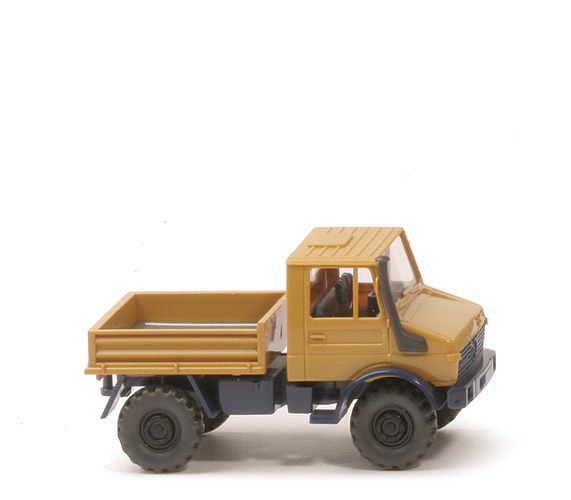 Farbe Kabine | braungelb | Verglasung | klar | Inneneinrichtung | stahlblau | Lenkrad | integriert | angesetzter Ansaugstutzen | anthrazit | Kotflügel vorne/Grill | stahlblau | Kotflügel hinten | stahlblau | Chassis | stahlblau | Zughaken | mit | Bodenprägung | WIKING, Berlin-W | Kardanelement Farbe | stahlblau | Pritsche | braungelb | Pritscheneinlage | silbern | Bemalung | ohne | Räder | 12 mm, grobstollig, separate Felgen | Felgen | 8-Loch, schwarz |