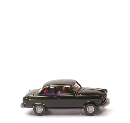 | Farbe | schwarz | | Grill | integriert | | Bedruckung vorne | Scheinwerfer silbern | | Verglasung | klar | | Inneneinrichtung | rot | | Lenkrad | integriert | | Chassisfarbe | silbern | | Bodenprägung | Borgward Isabella, WIKING, Berlin-W | | Bedruckung Heck | ohne | | Räder Typ | Riffelkappe | | Felgen | gesilbert |