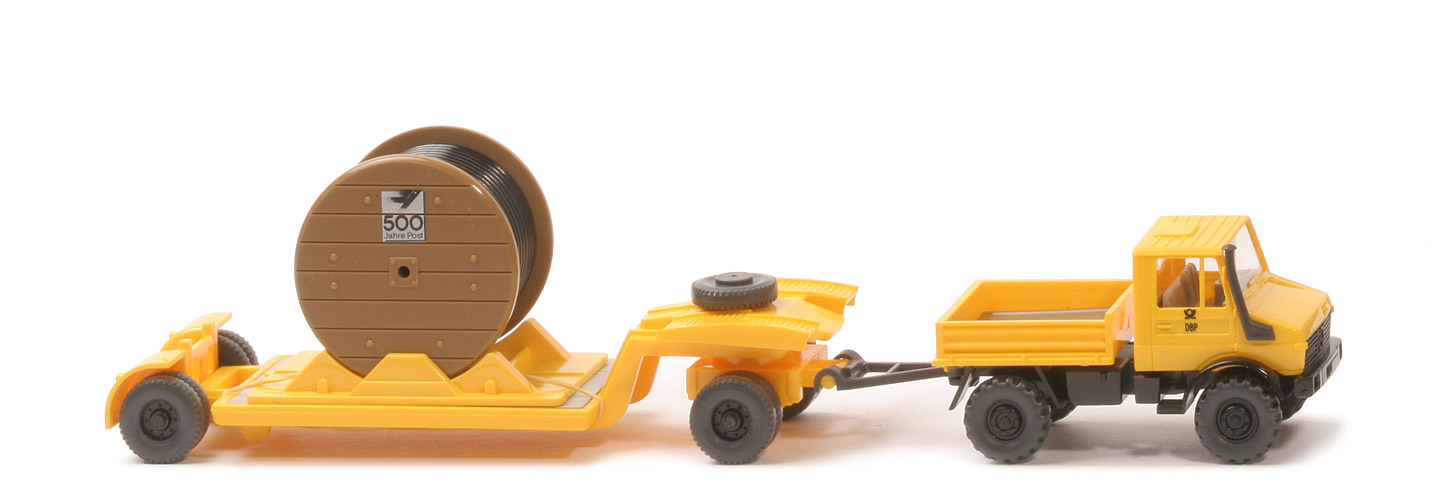 | Zugmaschine | Farbe Kabine | gelb | Beschriftung Türen | stilisiertes Posthorn, "DBP" | Verglasung | klar | Inneneinrichtung | ca. rotelfenbein | Lenkrad | integriert | angesetzter Ansaugstutzen | anthrazit | Kotflügel vorne/Grill | schwarz | Kotflügel hinten | schwarz | Chassis | schwarz | Bodenprägung | WIKING, Berlin-W | Auspuffrohr | mit | Kardanelement Farbe | schwarz | Pritsche | gelb | Pritscheneinlage | silbern | Räder | 12 mm, grobstollig, Felgen eingesetzt | Felgen | 8-Loch, schwarz | | Anhänger | Grundfarbe | gelb | gesteckte Rampe | gelb | gesteckter Radsatz | gelb | Pritsche | silbergrau | Bodenprägung | WIKING, Germany | Reserverad | über Drehschemel | Trommelhalterung | gelb | Trommel | ca. braungelb, Druck Logo 500 Jahre Post | Kabel | schwarz | Räder | 12 mm, 2-teilig, Felgen eingesetzt | Felgen | 8-Loch, schwarz |