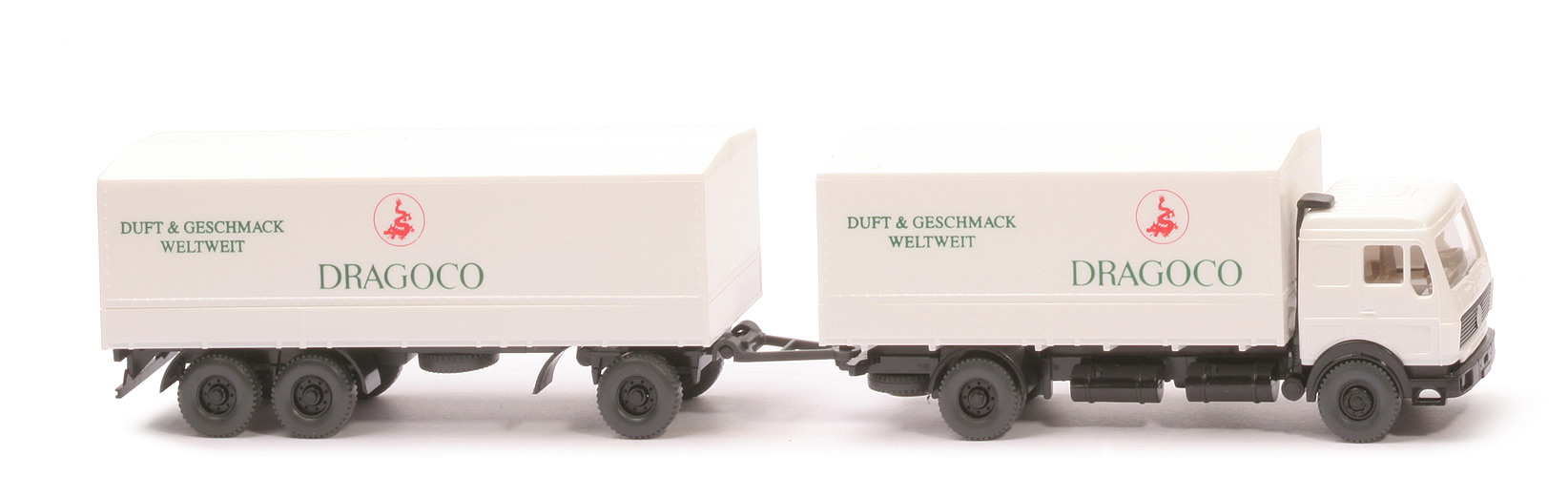 | Zugwagen | Kabine Farbe | weiß | hintere Seitenfenster | geschlossen | Scheibenwischer | mit | Heckfenster | geschlossen | eingesetzter Grill | schwarz, mit MB-Stern, ohne Streifen | Inneneinrichtung | ca. graubeige, Lenkrad integriert | Ansaugstutzen | schwarz, hinter Kabinenrückwand | Stoßstange | schwarz | Chassis | schwarz, BP WIKING, Berlin-W | Radlauf hinten | schwarz | Reserverad | hinten unter Chassis | Pritsche | Glattwand, weiß | Plane | weiß | Räder | 12 mm, Profil grob | Felgen | 8-Loch, schwarz | | Anhänger | Chassis | schwarz | Achshalterungen | schwarz | Unterfahrschutz | mit | Reserverad | unter Chassis | Pritsche | Glattwand, weiß | Plane | weiß | Räder | 12 mm, Profil grob | Felgen | 8-Loch, schwarz | | Beschriftungen | Pritschen | Dragoco (... s. Foto) | Planen | Dragoco ... |