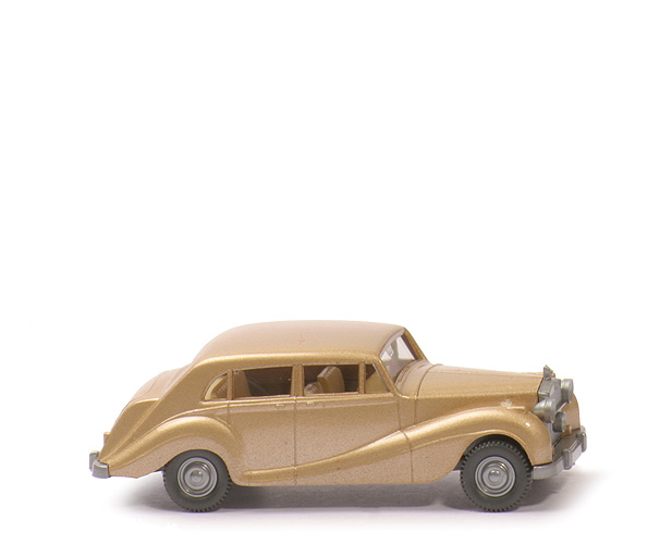 Farbe | goldmetallic Lack | Grill | silbern eingesetzt | Inneneinrichtung | ca. hellelfenbein | Lenkrad | integriert | Bemalung Rückleuchten | ohne | Chassisfarbe | silbern | Bodenprägung | Rolls-Royce 1951 WIKING Berlin-W | Räder | 9 mm | Radkappen | silbern eingesetzt |