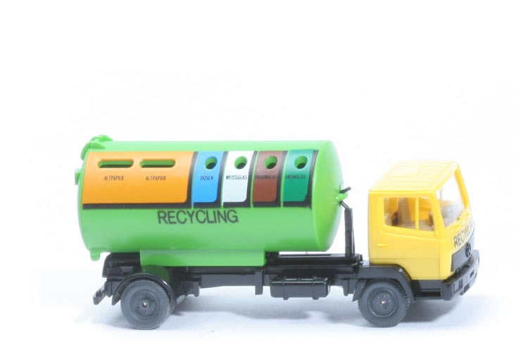 Kabine | hellgelbgün | Frontdruckung | Recycling | Grill | schwarz | Grillbedruckung | ohne | Inneneinrichtung mit Lenkrad | ca. zementgrau | Kotflügel, Stoßstange | schwarz | Chassis | schwarz | Schwenkmechanismus | schwarz | Bodenprägung | WIKING BERLIN-W | Container | gelbgrün | Beschriftung | Recyling | Druckfarbe bei Altpapier | gelborange | Bemalung | ohne | Räder | 10mm |