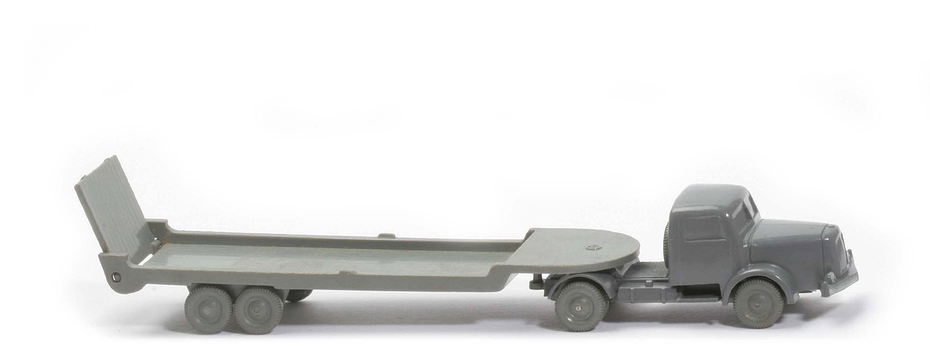 Achsen | Rollachser | | Zugmaschine | Farbe Kabine | staubgrau | Farbe Chassis | staubgrau | Bemalung | Scheinwerfer, Stoßstange | Sattelpfanne | eingesetzt, in Chassisfarbe | Chassis | Version 1a | Achshalterungen | geschlossen | Bodenprägung | WM (ohne Kreis) | Reserverad | hinter Kabine | Räder | 10 mm, Profil, hellgrau | | Auflieger | Achsen | Rollachser | Farbe | betongrau | Typ | vorn rund (Typ 1) | Seilwinde | ohne | Fläche über Drehschemel | mit Prägung WM im Kreis | Rückleuchten | ohne | Rampe | kurz | Stützen | ohne | Bodenprägung | ohne | Königsbolzen | kurz | Räder | 9mm, Profil, hellgrau |