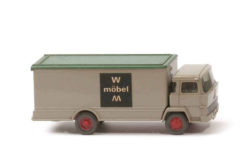 Farbe Kabine | olivgrau | Spiegel | ohne | Verglasung | getönt | Grill | silbern eingesetzt | Bemalung | Scheinwerfer | Inneneinrichtung | 2 Sitze, Motorblock | Armaturenbrett, Lenkrad | ohne | Farbe Innenrichtung | ca. basaltgrau | Chassis Farbe | hellbraunrot, glänzend | Bodenprägung | GERMANY, WM | Zughaken | entfernt | Reserverad | hinten unter Chassis gesteckt | hinterer Kotflügel | am Kofferaufbau | Aufbau Typ | flacher Koffer | Farbe Koffer | olivgrau | Farbe Türen | olivgrau | Farbe Kofferdach | laubgrün | Koffer Bodenprägung | 42 m | Beschriftung | WM möbel Nagativschrift schwarz/weiß | Beschriftung Art | Papieraufkleber | Räder | 11mm, Felge eingesetzt | Felgenfarbe | hellbraunrot |
