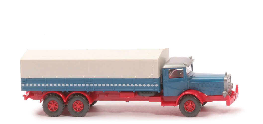 Kabine | capriblau | Dach | silbern | Verglasung | klar | Inneneinrichtung | rot, Lkr integriert | Grill | silbern, mit Stern | Chassis Farbe | rot | Kardaneinsatz Farbe | rot | Kardaneinsatz Bodenprägung | WIKING, Berlin-W | Zughaken | stilisiert | Reserverad | seitlich unter Pritsche | Kotflügel hinten | 2-teilig, rot | Pritsche | capriblau | Bemalung | umlaufende Rautenlinie weiß | Pritscheneinlage | Kunststoff, silbern | Bemalung | ohne | Plane | ca. grauweiß | Räder | 12 mm, Profil grob | Felgen | Trilex, rot |