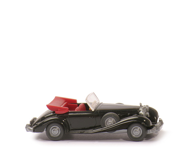 Farbe | schwarz | Grill | silbern eingesetzt | Reserveräder | auf vorderen Kotflügeln | Frontscheibe | klar transparent | Inneneinrichtung | ca. weinrot | Lenkrad | eingesetzt, ca. hellelfenbein | Verdeck | ca. weinrot | Bemalung Rückleuchten | ohne | Chassisfarbe | silbern | Bodenprägung | Mercedes/540K/WIKING/Germany | Räder | 9 mm | Radkappen | silbern eingesetzt |