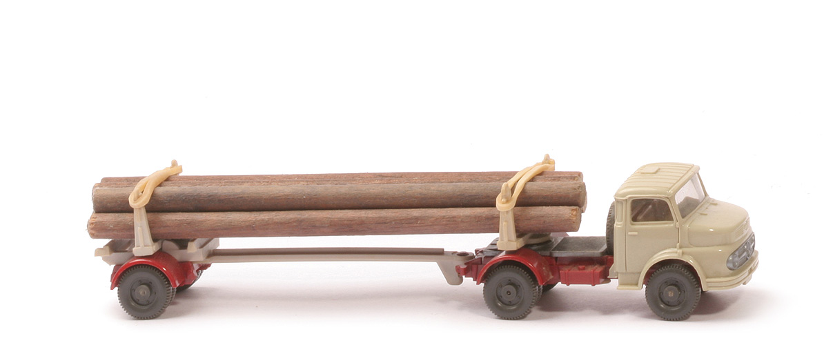 | Zugmaschine | Farbe Kabine | hellgelbgrau | Lüfter | mit | Eckfenster | mit | Blinker | auf Kotflügel | Verglasung | leicht getönt | Inneneinrichtung | ca. hellgelbgrau | Chassis | weinrot | Radlauf hinten | weinrot | Sattelpfanne | für großen Königsbolzen | Reserverad | hinter Kabine | Räder | 11mm, einteilig, Profil fein | | Auflieger | Rungen | hellelfenbein | Deichsel | hellelfenbein | Gestaltung Deichsel | Zughaken übergreifend | Radlauf | weinrot | Königsbolzen | stark | Reserverad | unter Chassis | Räder | 11mm, einteilig, Profil fein | Ladung | 7 Baumstämme | Befestigung der Ladung | Gummibänder |
