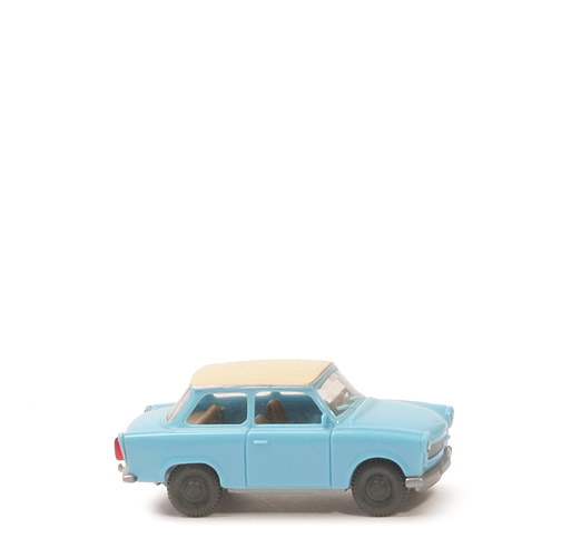 Farbe | hellblau | Dach | ca. gelbelfenbein schabloniert | Grill | silbern eingesetzt | Scheinwerfer | klar transparent, eingesetzt | Inneneinrichtung | braungelb, Lkr separiert | Außenspiegel | beidseits | Scheibenwischer | plastisch | Rückleuchten | rot transparent eingesetzt | Chassis | silbern | Zughaken | integriert, sehr grazil | Bodenprägung | neues Wiking-Logo, Trabant 601 S, Germany | Räder | 7 mm | Radkappen | ungesilbert |